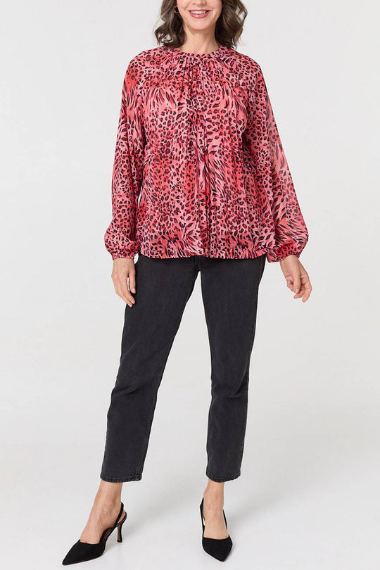 Animal Pink Print Ruched Long Sleeve Blouse with a round neck, long balloon sheer sleeves and a hip length hem.