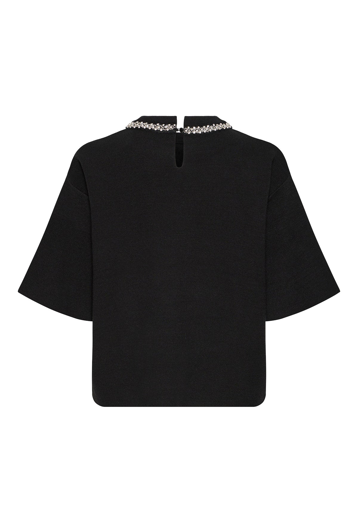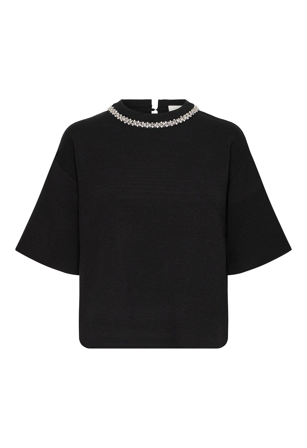 Boxy short sleeve top features a chic jewel-embellished neckline with subtle notched detail. The structured silhouette and soft finish add a refined modern edge to any look.