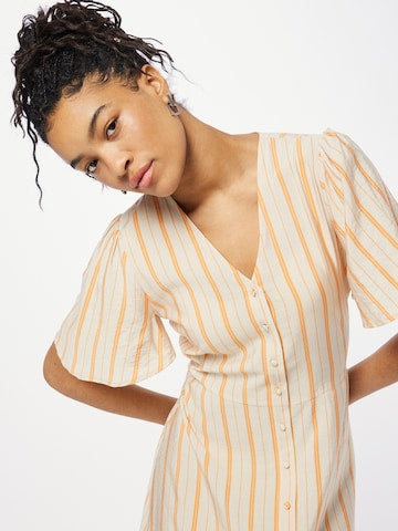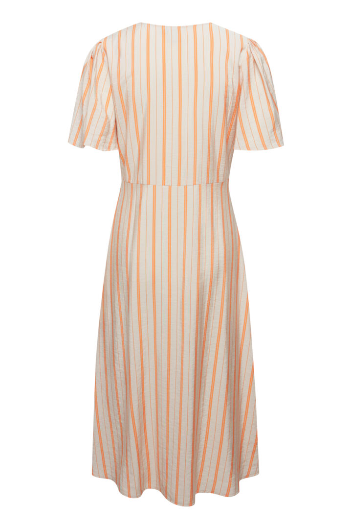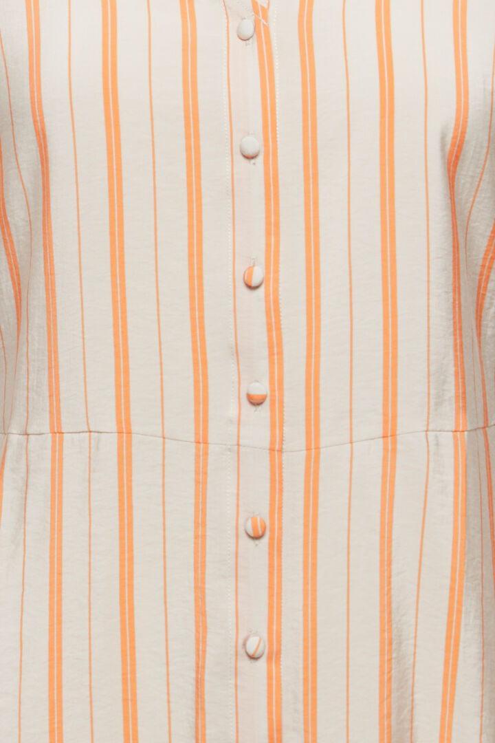 featuring v neck and cap sleeves, orange stripes on a cream background.