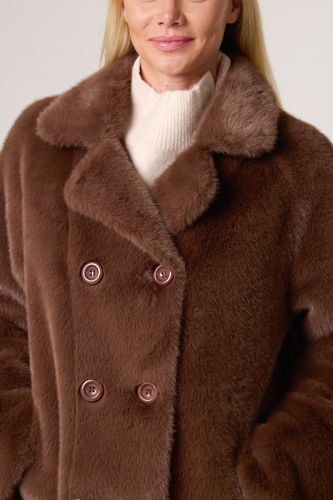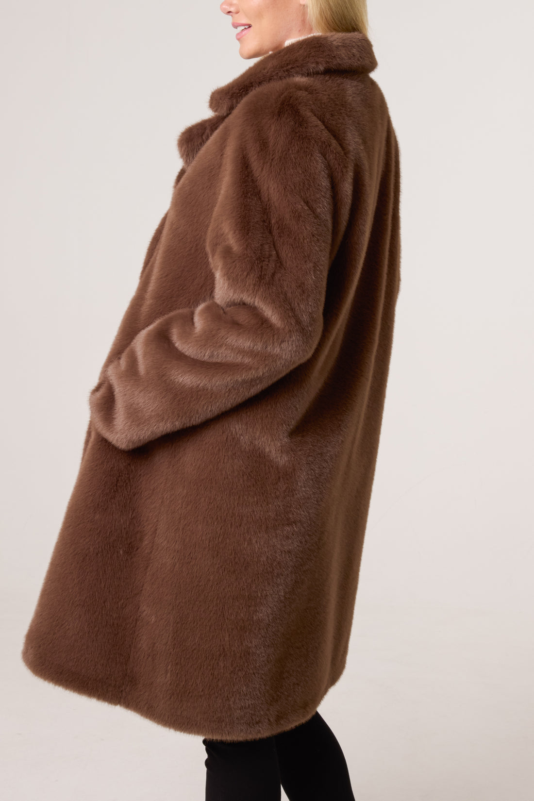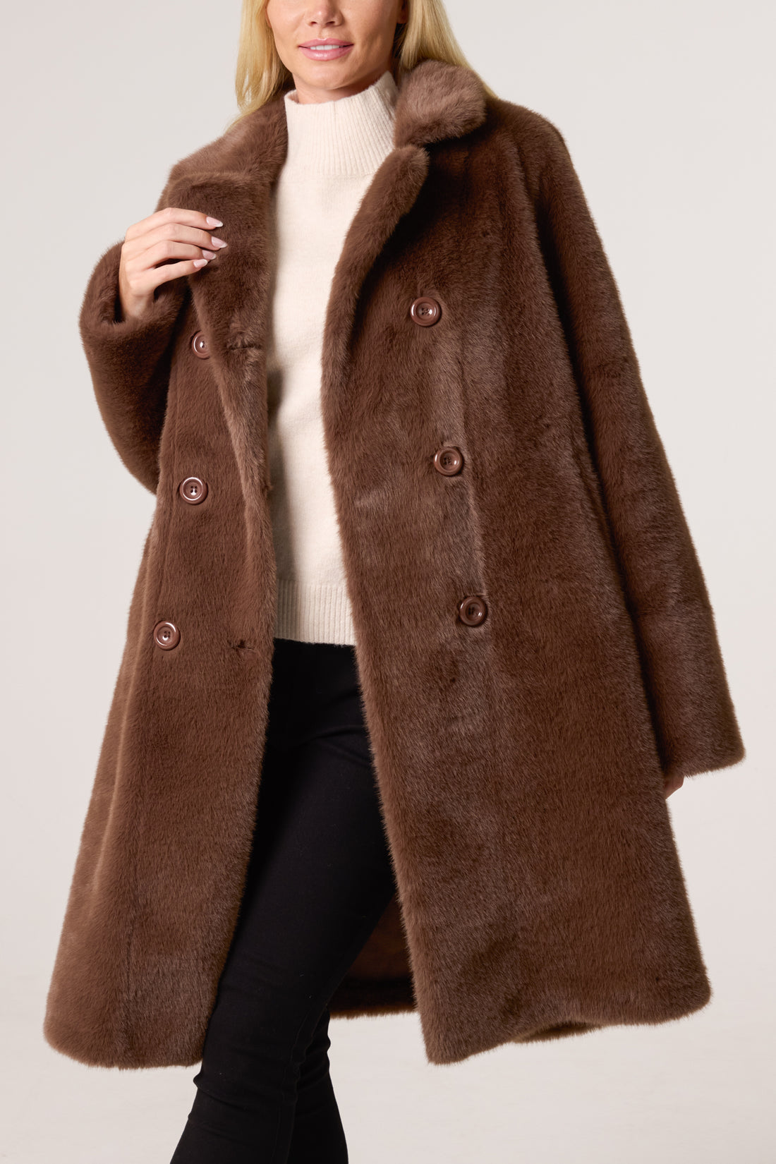 This longline faux fur double breasted coat is the perfect addition to your winter wardrobe. With its luxurious feel and practical pockets, you'll be stylish and warm all season long. Glam up any outfit and stay cozy at the same time.