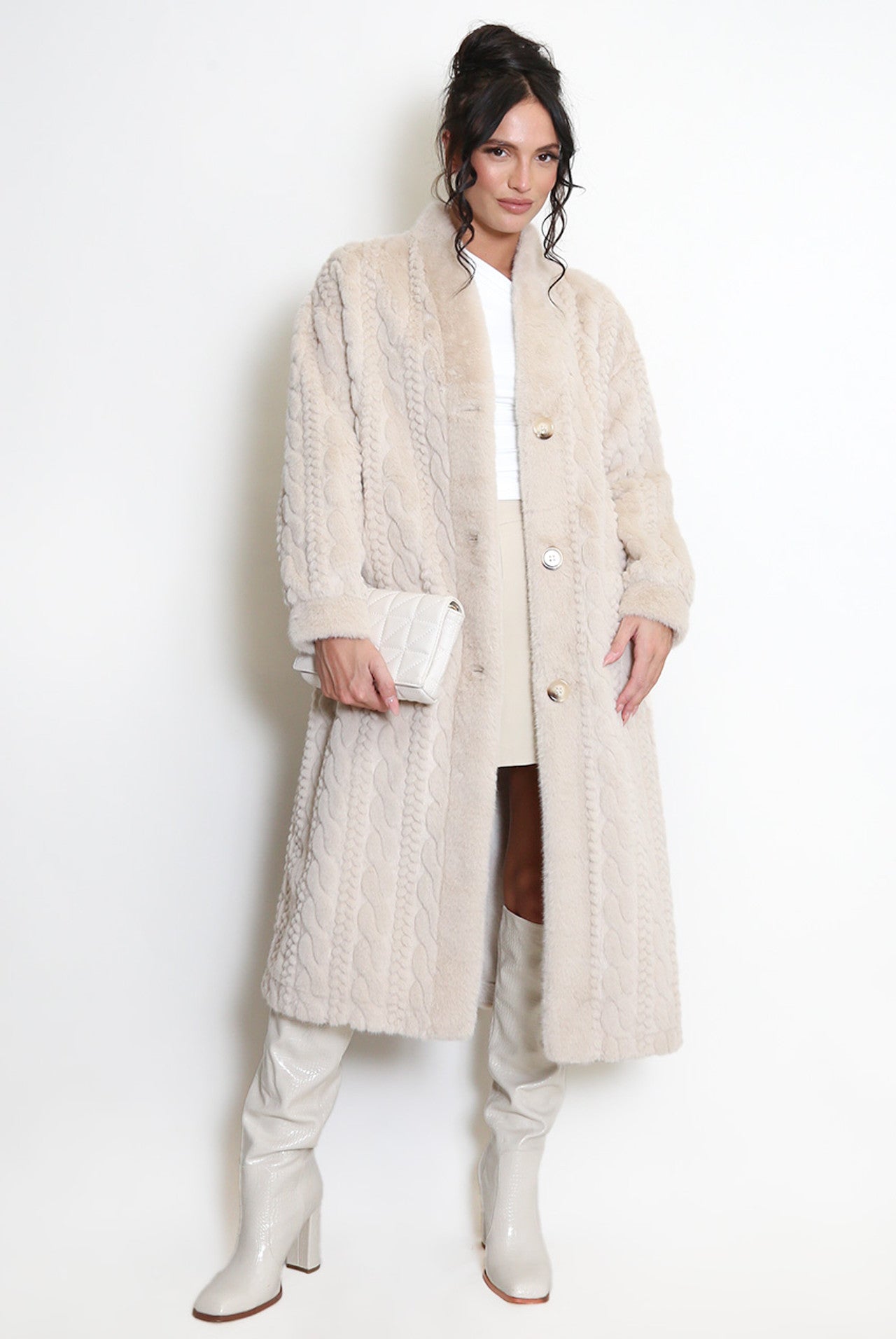 Indulge in luxury with the Jodie Faux Fur Cable Coat Cream. This chic long coat features a button-down front and cable pattern, adding a sophisticated touch to any outfit. Made with soft faux fur, it will keep you warm and stylish all winter long. Don't wait, elevate your outerwear game today!