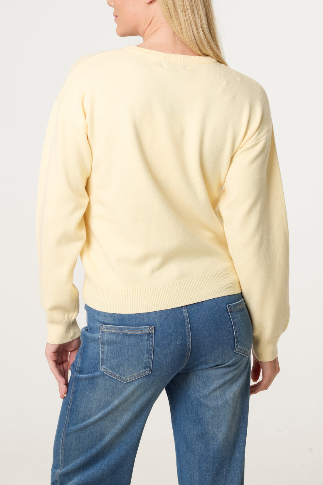 This Karis Embellished Strawberry Jumper in Buttermilk Yellow is the perfect addition to your wardrobe. The strawberry embellishments add a touch of playful charm to the classic buttermilk yellow color. Stay cozy and stylish in this unique piece.