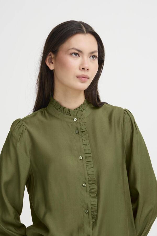 This women's blouse features a relaxed fit, refined high neckline with delicate ruffle, and long sleeves with buttoned cuffs. The button-down design and soft fabric offer all-day comfort, ideal for versatile wear.