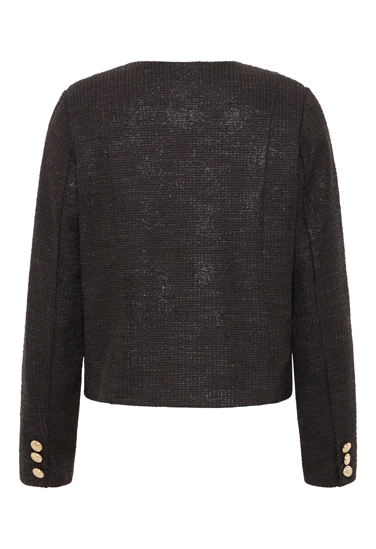 Cropped jacket with a subtle textured weave, straight silhouette, and round neckline. Features statement metallic buttons, long sleeves, and front flap details.