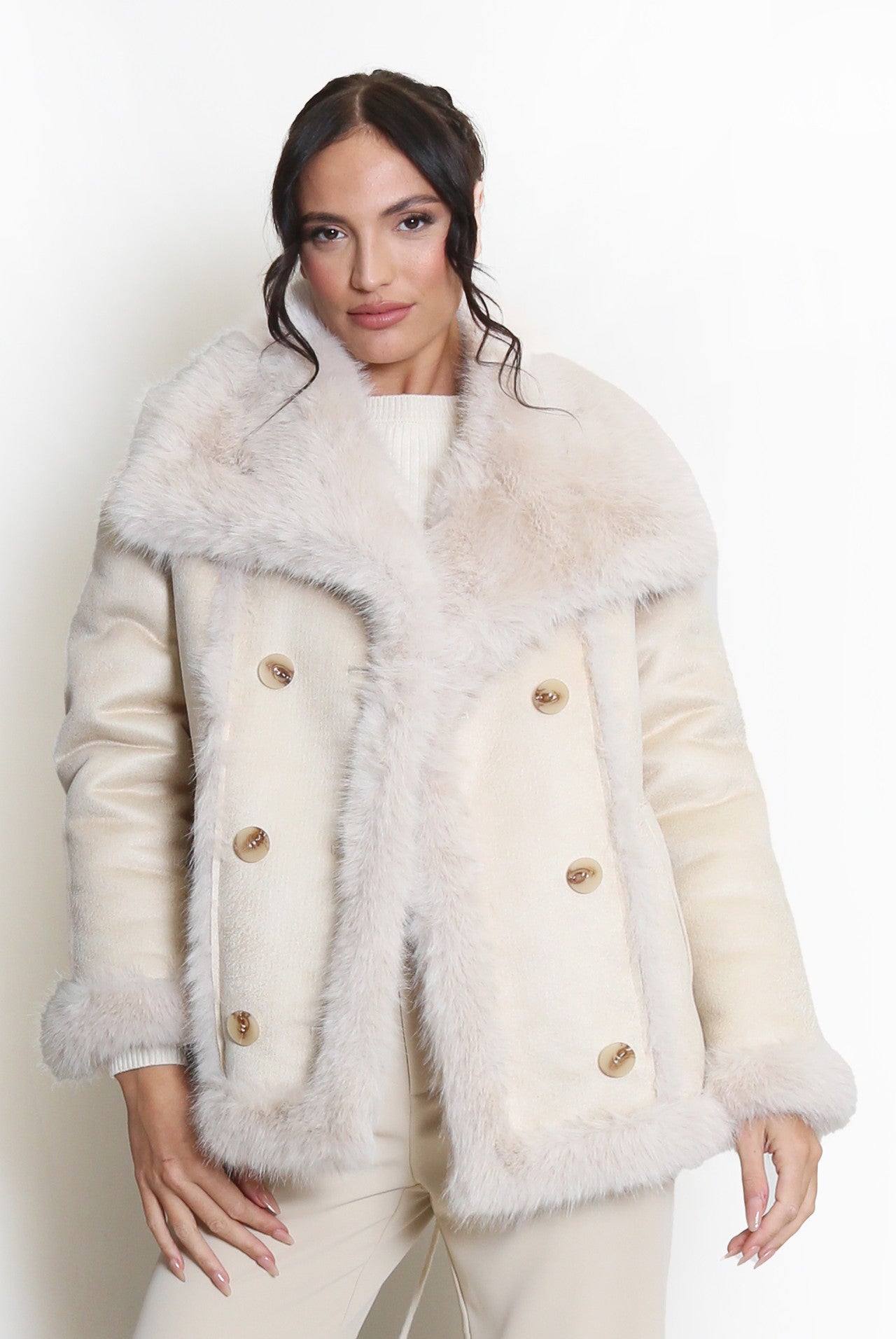 This Lynsey Suede and Shearling Jacket in Cream offers a sophisticated blend of style and warmth. Double breasted and rafted with soft suede and lined with plush shearling, it provides exceptional insulation for chilly winter walks and festive occasions. Its tailored design ensures a flattering fit while delivering cozy comfort, making it an ideal choice for those seeking both elegance and practicality during colder months.