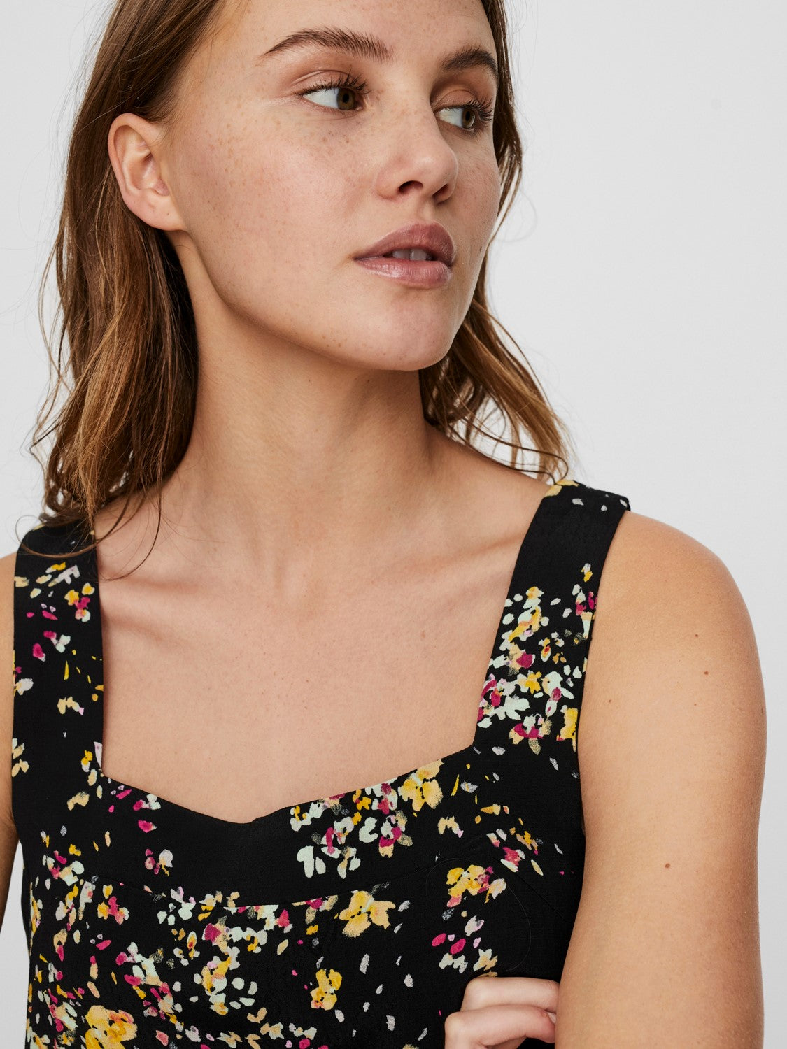 - Printed top. - Regular fit. - Soft viscose material. - Squared neckline. - Length: 60 cm in a size M. - The model is 177 cm tall and wears a size M.