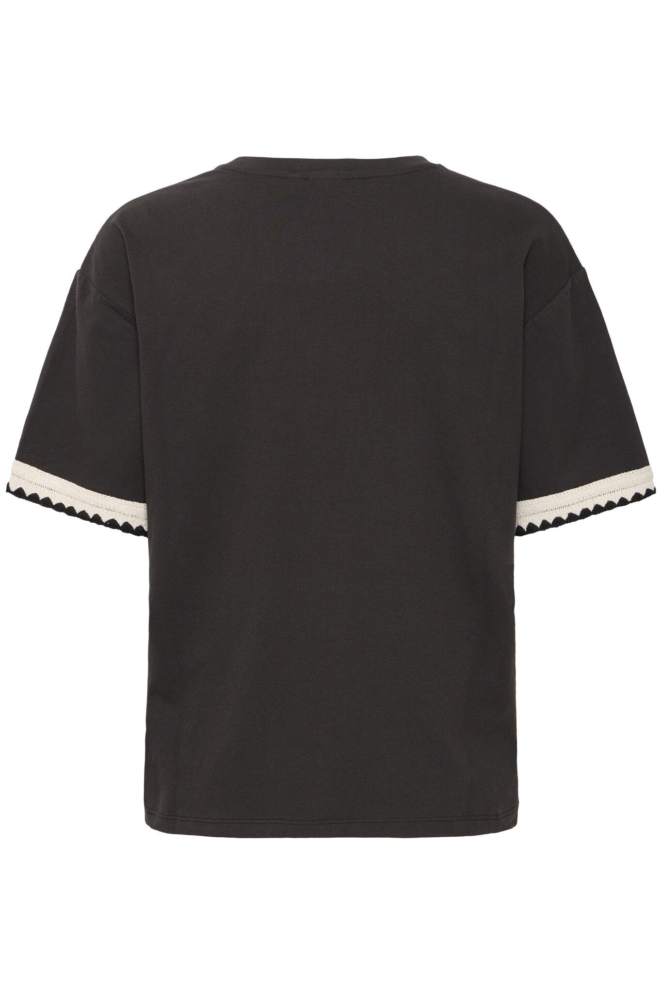 This black T shirt by Ichi features an embroidered trim on the sleeve for a touch of elegance. Crafted from soft and breathable fabric, it offers both comfort and style. Perfect for any casual or dressy occasion, this versatile shirt is a wardrobe essential.