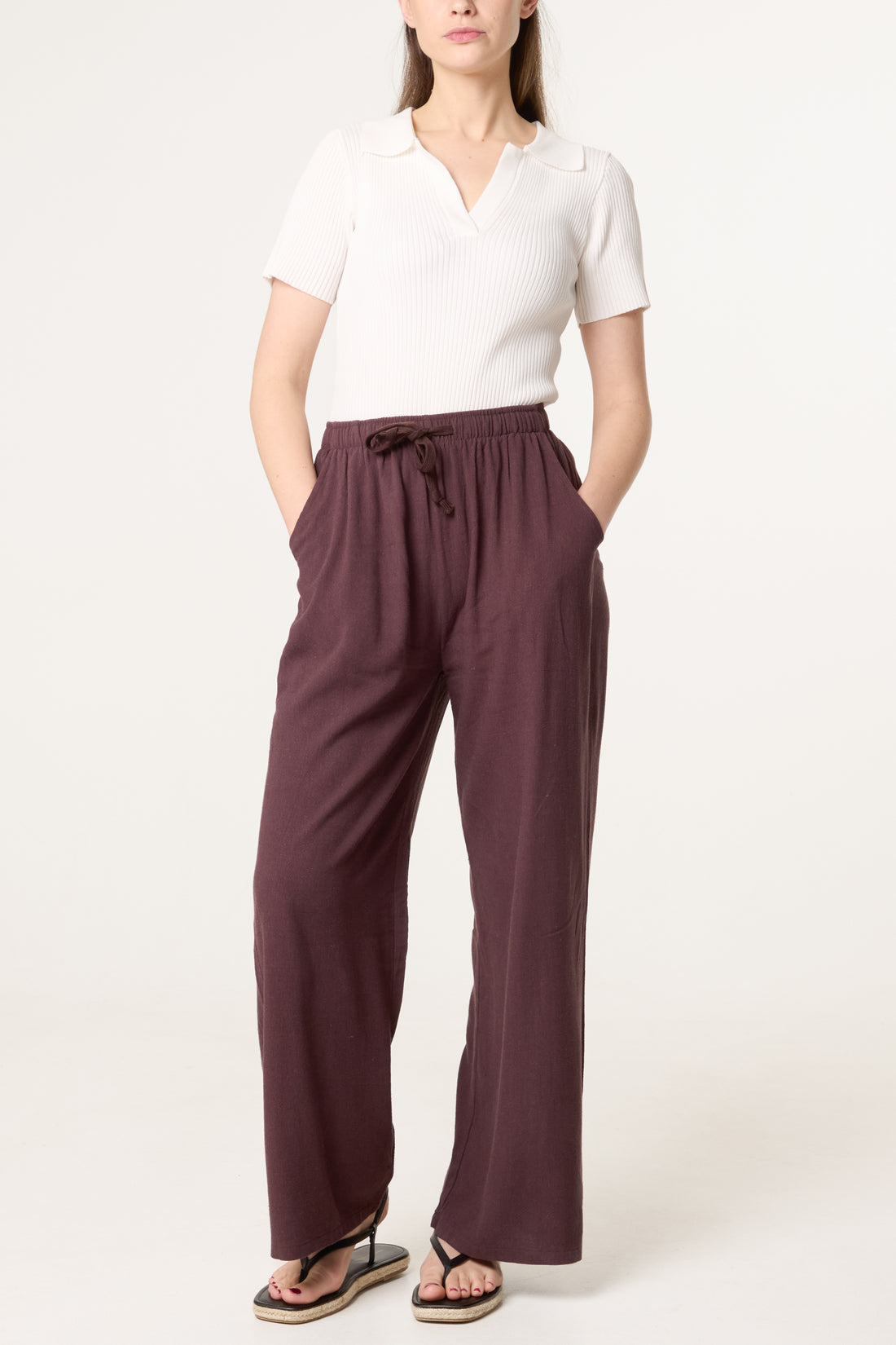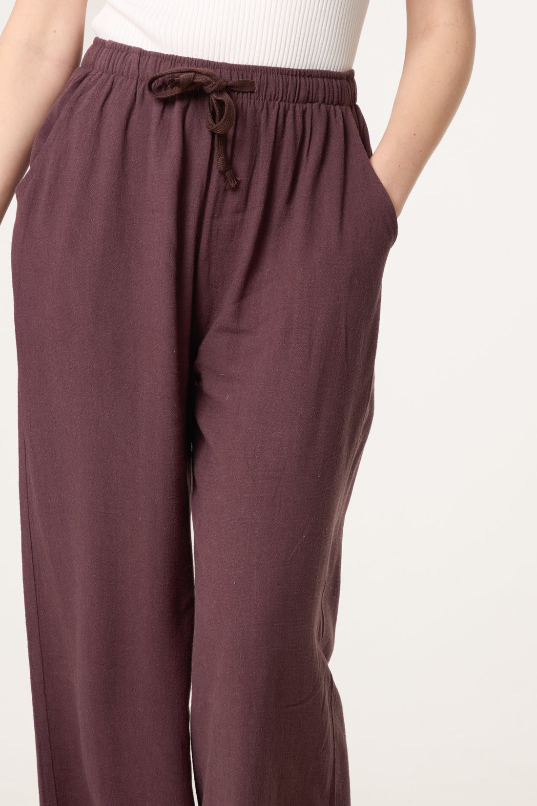 The Penny Linen Blend Trousers in chocolate brown feature a comfortable linen blend fabric and an elasticated waist, ensuring ease of movement. Equipped with pockets, these trousers offer both practicality and style, making them suitable for various casual occasions. The breathable material enhances comfort in warmer climates.
