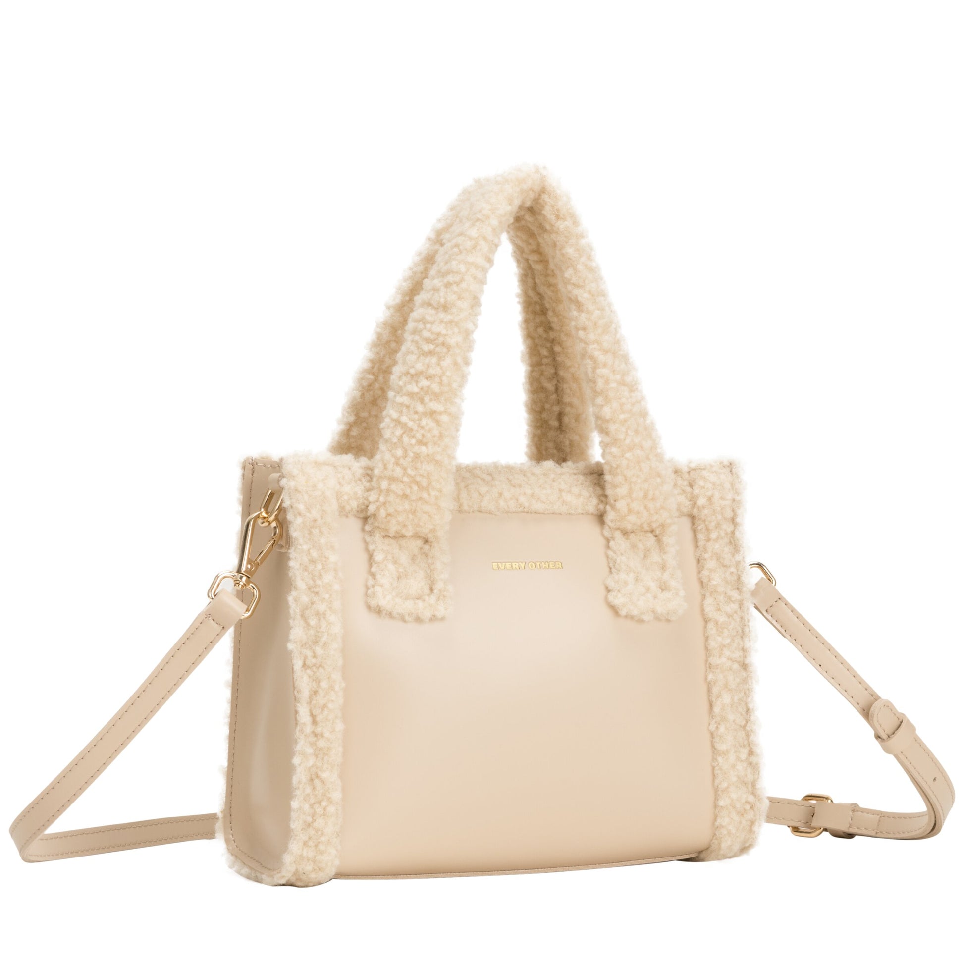 The Square Shearling Grab Bag in brown features a sophisticated top handle for easy carrying and includes a detachable crossbody strap, offering versatile styling options. Crafted with a stealing trim, this bag combines classic shearling texture with modern design, making it perfect for both hands-free and handheld use. Its structured square silhouette ensures elegance while providing practical everyday functionality.