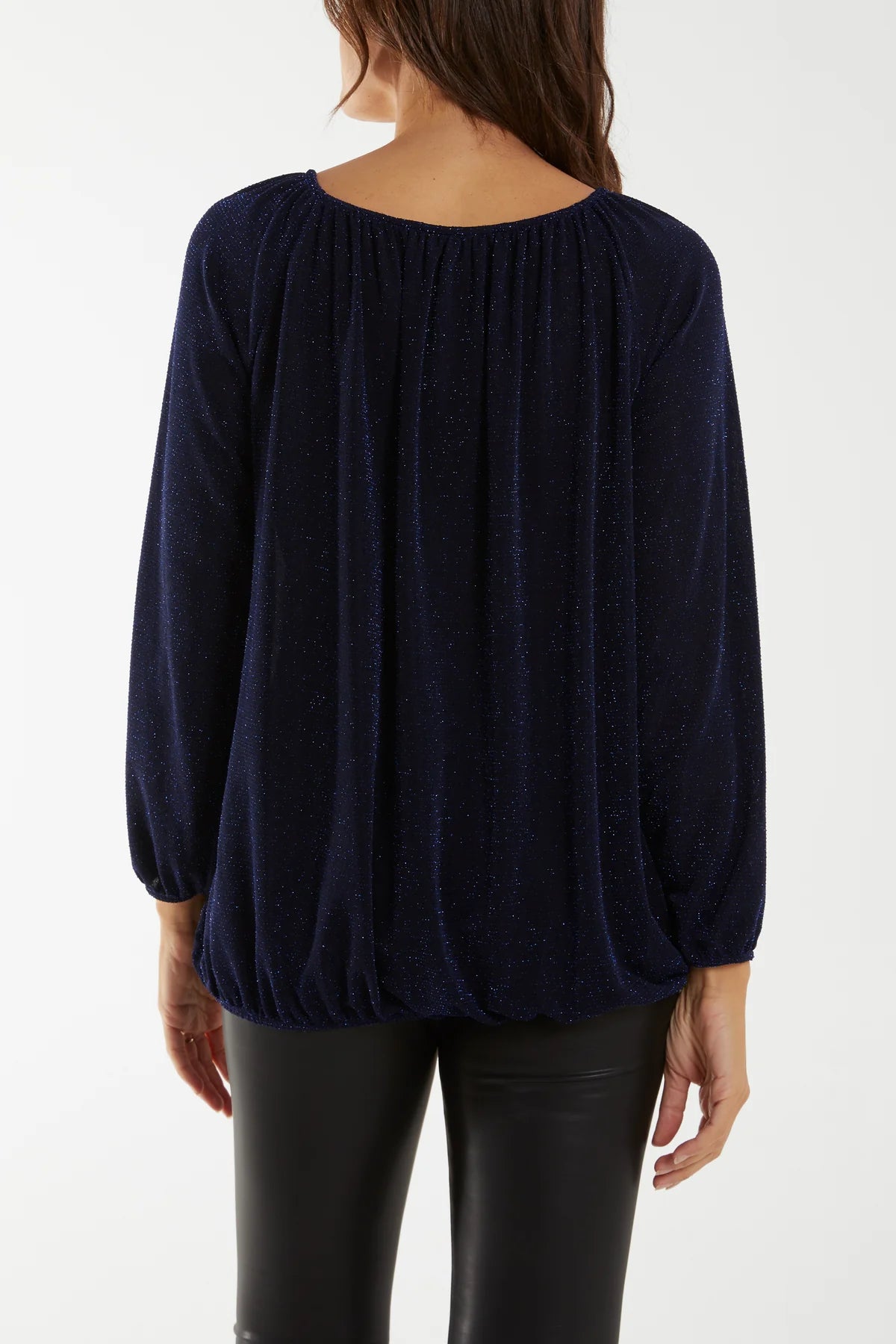 Expertly crafted with a touch of shimmer, the Zoe Glitter Bow Blouse with navy shimmer is the perfect addition to your wardrobe. This versatile piece is designed for both day and night, effortlessly pairing with jeans or leather trousers for a stunning look. Add a dazzling touch to your outfit with this must-have top.